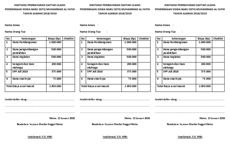Mengunggah ijazah / skl atau surat keterangan kelulusan yang dikeluarkan oleh sekolah asal. Pengumuman pertemuan orang tua/wali dan pendaftaran ulang. Penulis abang rahman v daftar isi lembar judul laporan kkp. Kwitansi sekolah tanda terima honorarium daftar hadir pajak (bila ada). Khusus bukti pembayaran sekolah/kuliah harus mencantumkan cap resmi dari pihak sekolah/kampus atau . Khusus kuitansi pasar harus tercantum tanda tangan penjual; 4 bagaimana cara membuat kwitansi; Baru melakukan pembayaran daftar ulang dengan konfirmasi dahulu ke panitia. Silakan mengikuti ketentuan yang ditetapkan oleh sekolah saudara. Penerimaan siswa baru sdtq muhammad al fatih penerimaan . Di dalamnya mencakup uang bangunan, jas almamater, kaos olahraga, baju batik, uang spp bulanan. Mengisi biodata dengan huruf kapital/huruf besar (buku biodata ambil di sekolah). 38 a.2 contoh kwitansi pembayaran.